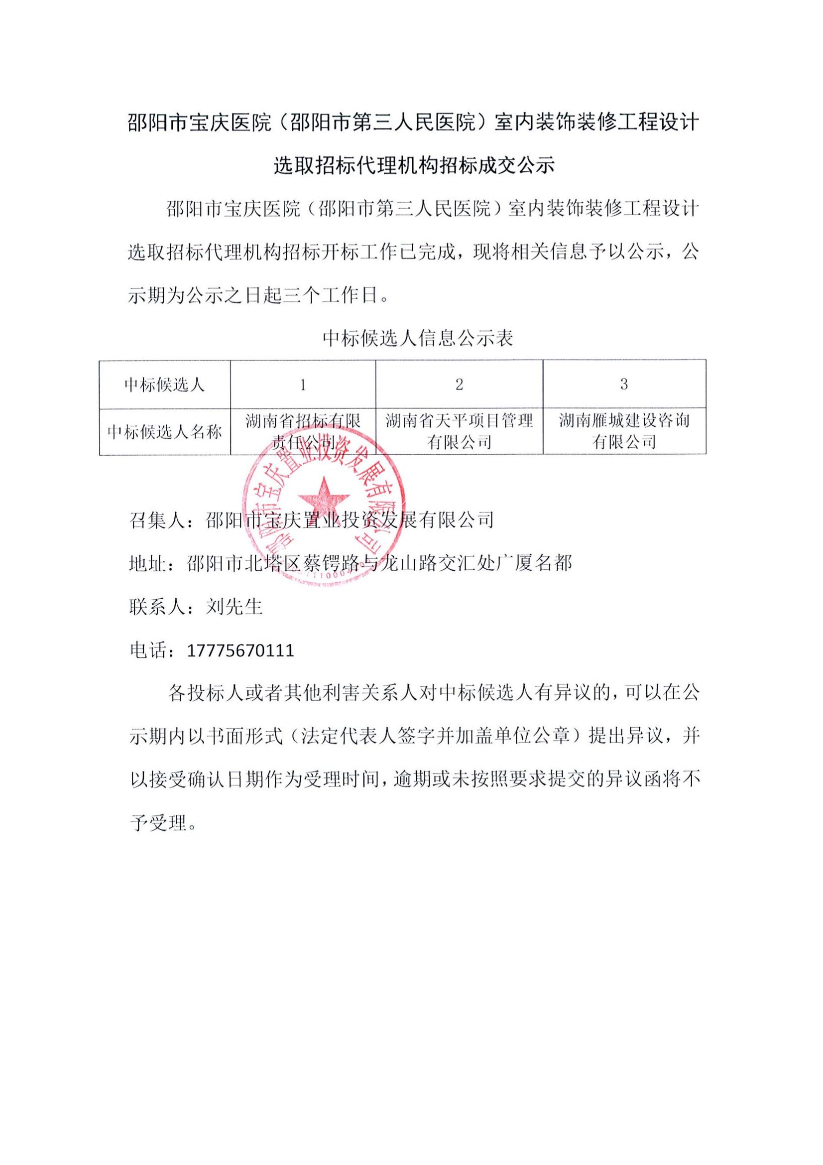 邵陽市寶慶醫(yī)院(邵陽市第三人民醫(yī)院)室內(nèi)裝飾裝修工程設(shè)計選取招標(biāo)代理機(jī)構(gòu)招標(biāo)成交公示